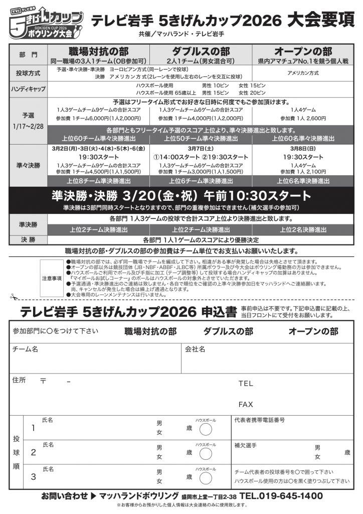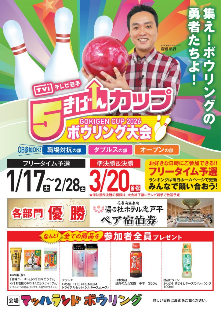 今年も開催します!5きげんカップボウリング大会 2026年1月5日ボウリングのイベントページBL 今年も5きげんカップボウリング大会を開催いたします。 今回も職場対抗の部・ダブルスの部・オープンの部の3部門! すべての部門、1月17日(土)からフリータイム予選スタート! なんと、ご参加いただいた方全員に、豪華な参加賞をプレゼント! フリータイム予選期間中は、お好きな日時に何度でもご参加いただけます。 そして、各部門の優勝はホテル志戸平のペア宿泊券🏆️ たくさんのご参加をお待ちしております!!